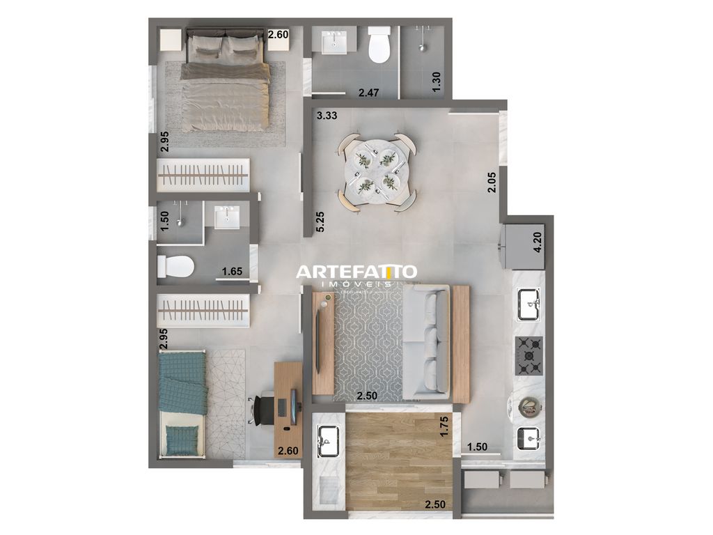O apartamento conta com 2 dormitórios, sendo 1 suíte, além de 2 banheiros, com uma planta inteligente que valoriza a iluminação natural e a ventilação.
