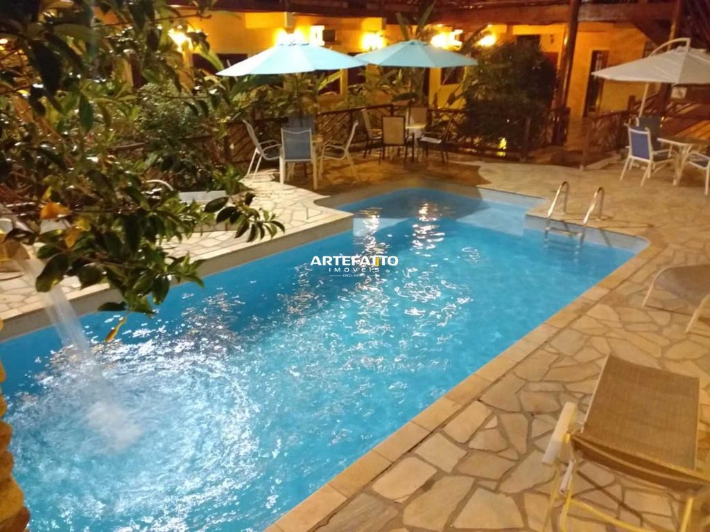 Há uma piscina com cascata, cadeiras e mesas, além de um bonito jardim, para o descanso e diversão dos hóspedes.