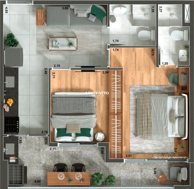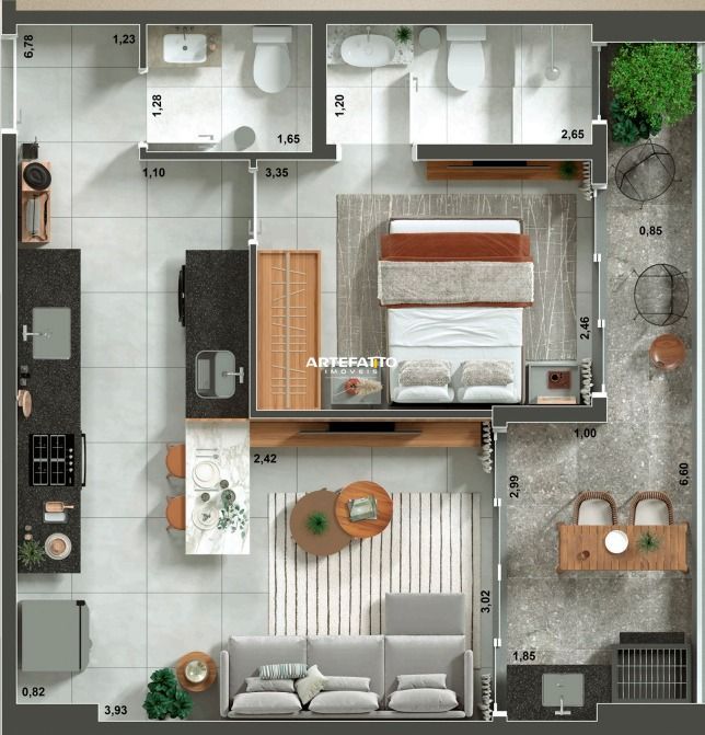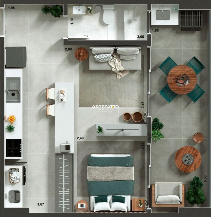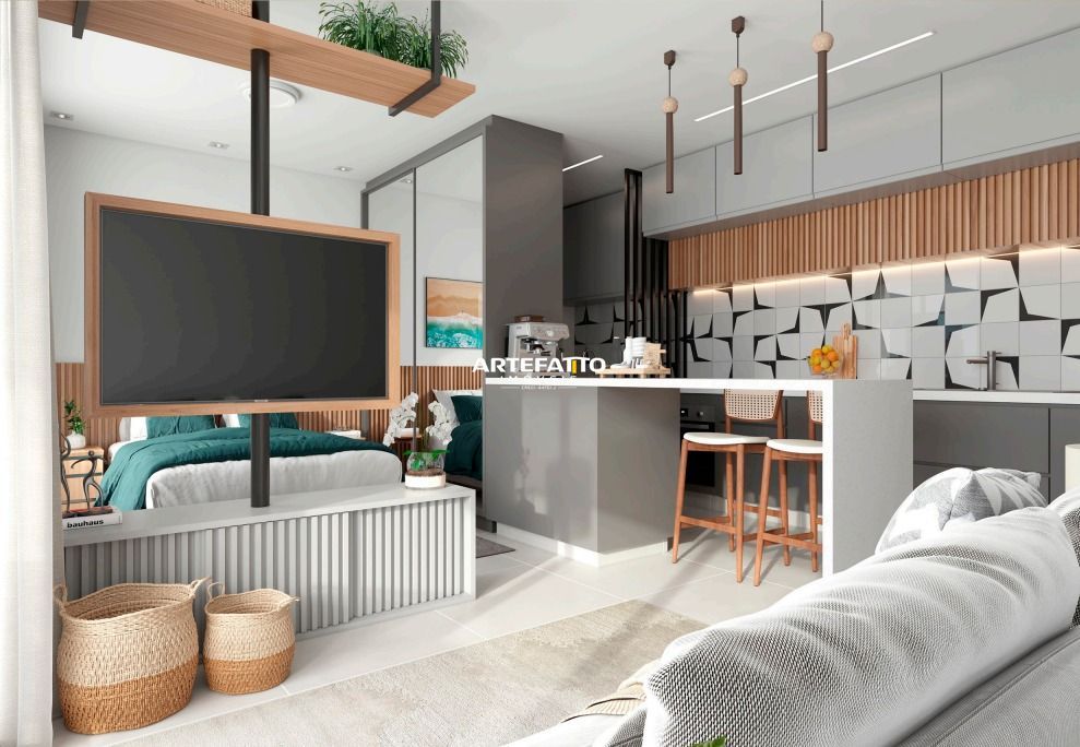 Stúdio com área útil fantástica, contando com varanda gourmet com churrasqueira, armário náutico, 1 vaga de garagem.