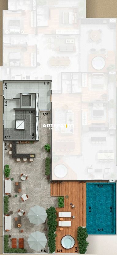 Condomínio com piscina, churrasqueira, estacionamento coberto, portaria.
